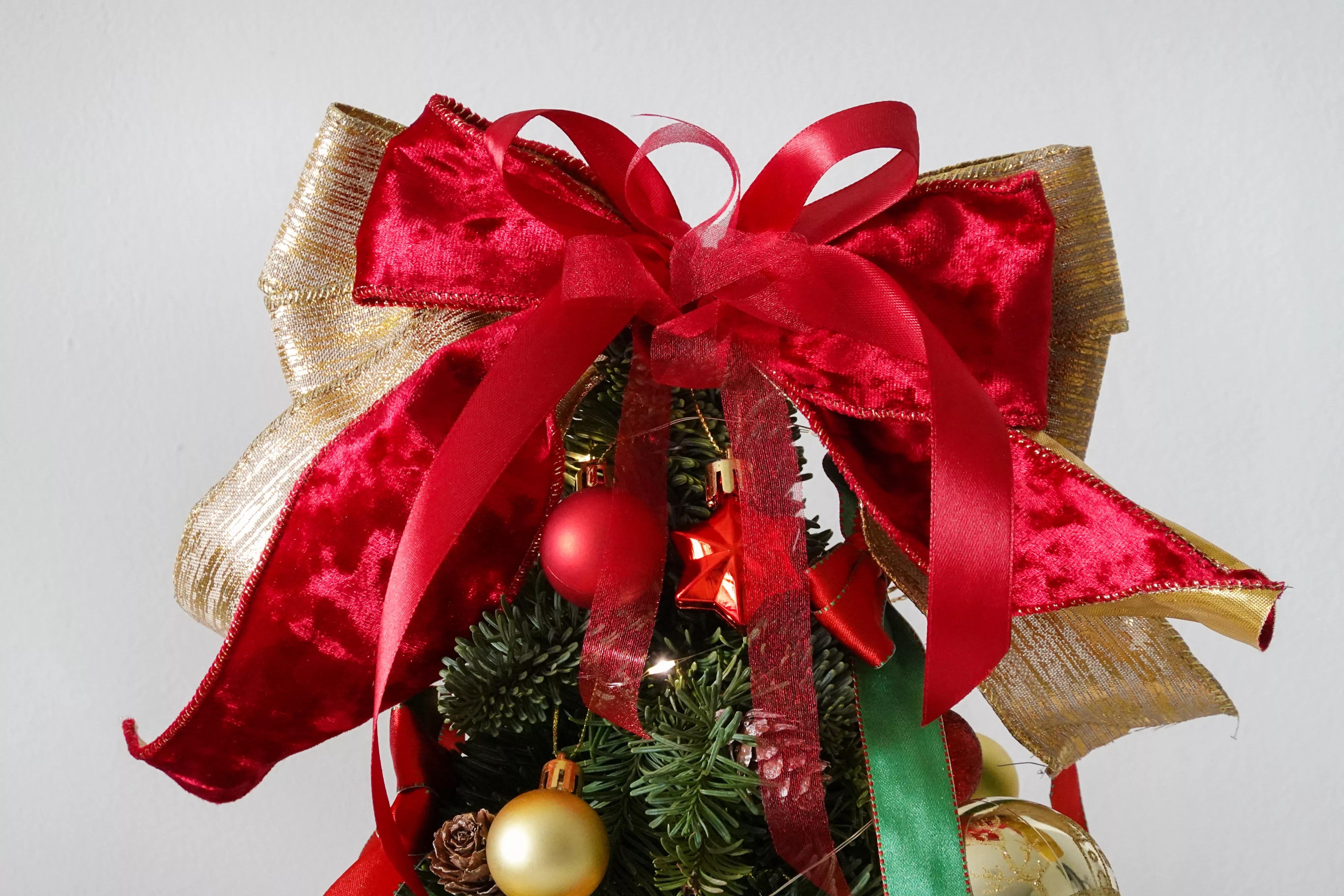 Each tree is adorned with warm fairy lights, luxurious ribbons, and elegant ornaments, thoughtfully arranged to create a refined yet cozy holiday centrepiece perfect for desks, bedrooms, living rooms, or gifting.