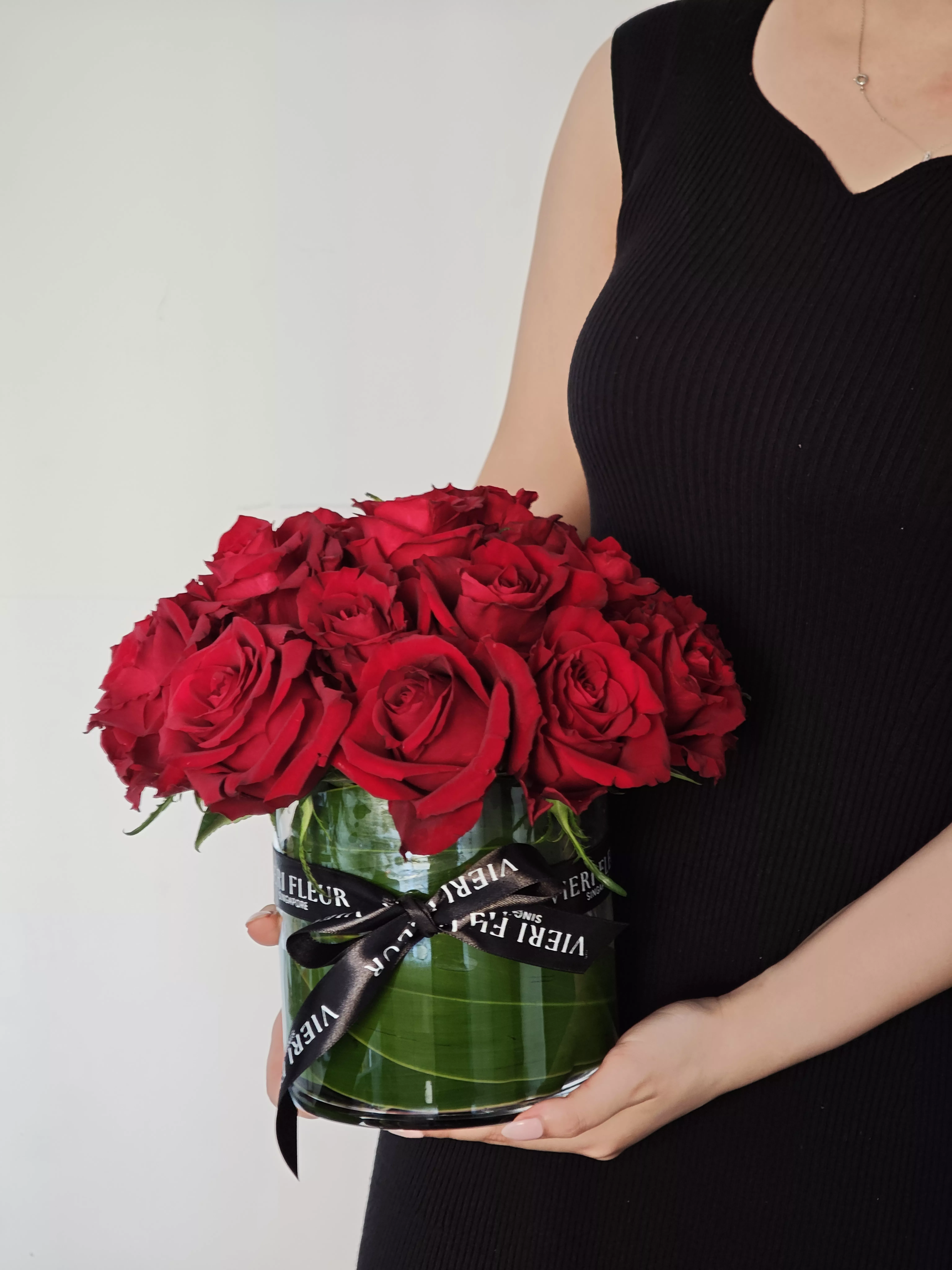 A romantic round bouquet of fresh red roses, symbolizing timeless love, crafted with hand-picked blooms of the finest quality.